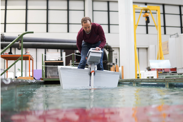 To validate this workflow under real LFAM conditions, a boat hull was printed entirely with 45° inclined layers. The demonstrator illustrates how rule-based parametrisation, algorithmically generated bridge surfaces and continuous toolpaths can produce self-supporting, watertight structures without support material.